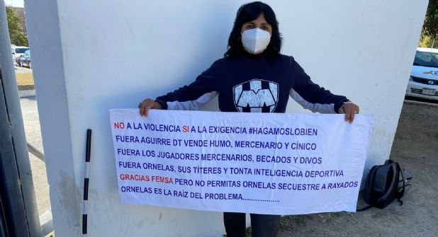 "No a la violencia, sí a la exigencia. #HagámosloBien. Fuera Aguirre, DT vende humo, mercenario y cínico. Fuera los jugadores mercenarios, becados y divos. Fuera Ornelas, sus títeres y tonta inteligencia deportiva. Gracias FEMSA, pero no permitas Ornelas secuestre a Rayados. Ornelas es la raíz del problema", redactó en la pancarta.