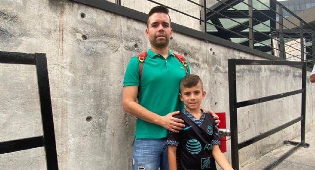 Pedro, seguidor regiomontano de 8 años de edad, acudió junto a su padre al hotel donde el cuadro azulcrema se concentra para el duelo de este sábado.