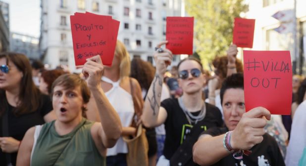 Un grupo de manifestantes marchó hasta la Puerta del Sol para continuar la protesta frente a la sede de la Comunidad de Madrid, en una de varias concentraciones convocadas para denunciar el comportamiento de Rubiales.