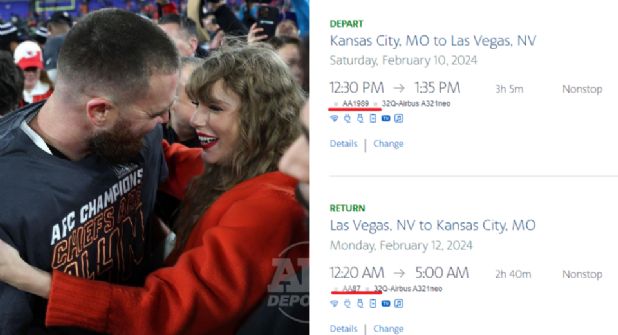 Por el otro lado de la moneda, el número de vuelo de regreso de Las Vegas a Kansas es "87", ese es el mismo número utilizado por el ala cerrada All-Pro de los Chiefs, dos veces campeón de la NFL y compañero superestrella del pop, Travis Kelce. El viaje de vuelta de Kansas City está programado para el lunes 12 de febrero a las 12:20 a.m. en Las Vegas, pocas horas después de que termine el juego.