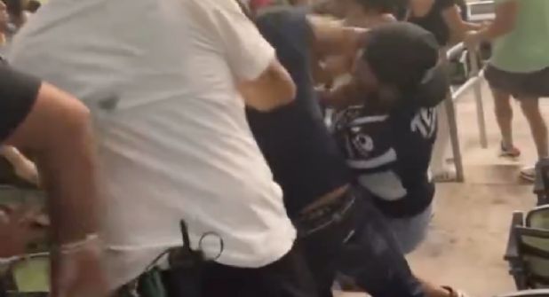 Posteriormente un hombre intenta separar a los conflictivos, pero también resultó golpeado por otro aficionado rayado que bajó la escalera para unirse a la pelea.