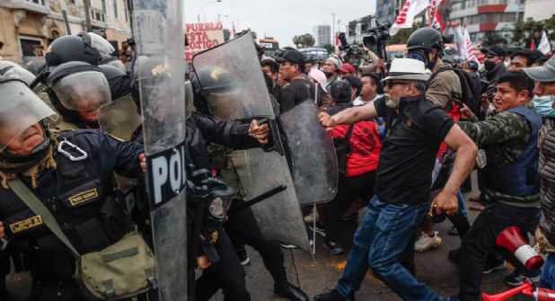 Los simpatizantes de Castillo lanzaron piedras, adoquines y otros objetos a los cuerpos policiales de la PNP en el centro de la capital peruana en protesta por la detención del expresidente.