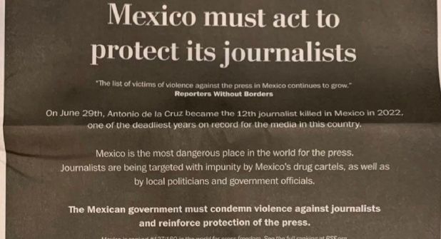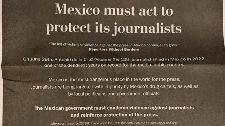 El desplegado, a una plana completa, fue titulado “México debe actuar para proteger a sus periodistas” y señala que el pasado 29 de junio Antonio de la Cruz se convirtió en el doceavo reportero en ser asesinado en lo que va del 2022, “uno de los años más mortales de los que se tiene registro para los medios en este país”.