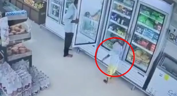 Según las imágenes capturadas, un hombre se encontraba a un costado examinando el interior de otro refrigerador mientras la niña, descalza, intenta abrir la puerta.