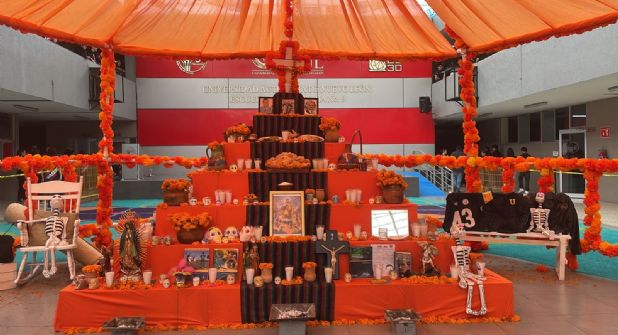 Con los principales elementos del altar de muertos, que cada uno tiene su historia, como las veladoras, sal, agua, copal e incienso, pan de muerto, imágenes religiosas y las flores de cempasúchil, es como ofrendan el mega altar en la institución en memoria de los tres profesores.