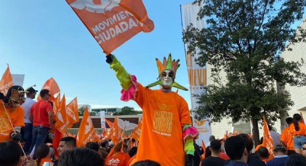 El escenario se asemejaba a un carnaval regiomontano: tambores retumbaban, música festiva, resonaba, arlequines y botargas de personajes de la cultura pop local danzaban entre las gradas adornadas con camisetas naranjas, las cuales portaban, mensajes como “Por un Presidente Regio” y “El Nuevo Samuel” se compartían orgullosamente en las vestimentas de los simpatizantes.