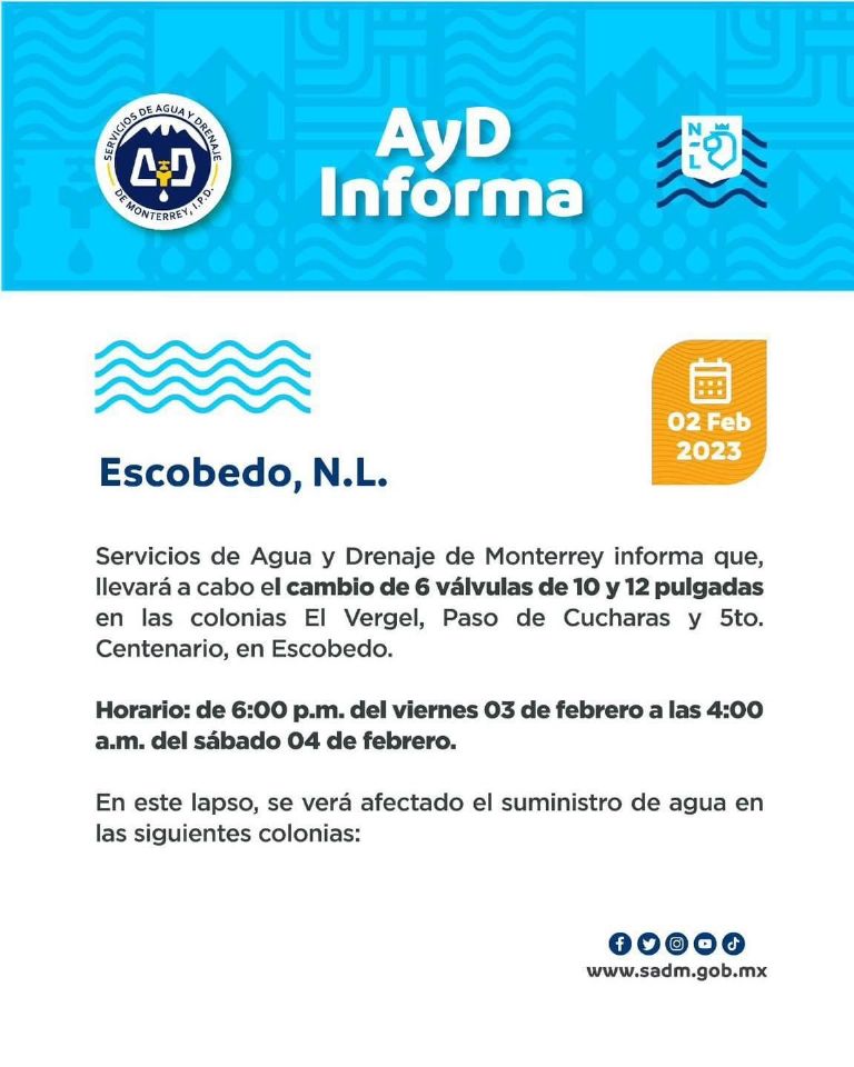 "Servicios de Agua y Drenaje de Monterrey informa que, llevará a cabo el cambio de 6 válvulas de 10 y 12 pulgadas en las colonias El Vergel, Paso de Cucharas y 5to. Centenario, en Escobedo", informó Agua y Drenaje a través del comunicado.