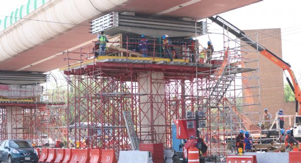 Ahí, siguen colocados los andamios, y sobre ellos, se pudo observar al menos a 40 trabajadores realizando tareas como colocación de estructuras para reforzar capiteles, envarillado y pintura e incluso apoyados con grúas y tráileres de plataforma que siguen trasladando material al lugar.
