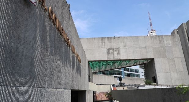 Una fachada con grietas, un escudo del Estado lleno de manchas, luminarias quebradas, baños convertidos en bodega, una fuente con agua estancada, elevadores remolones que se atoran y un clima central caprichoso que a veces no quiere funcionar.