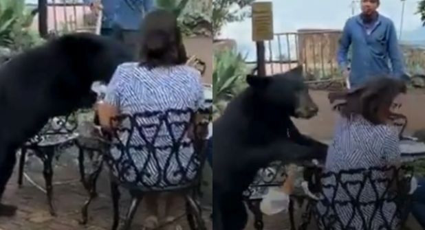En este video se aprecia cuando el oso se acerca a la mesa donde una mujer y un hombre se encontraban comiendo y, una vez ahí, el animal comienza a devorar la comida que había en los platos de las dos personas.