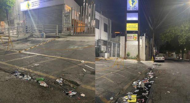 Monterrey.- Tras el debate de candidatos a la alcaldía de Monterrey, las calles Platón Sánchez, 5 de mayo y Vicente Riva Palacio, quedaron plagadas de basura.