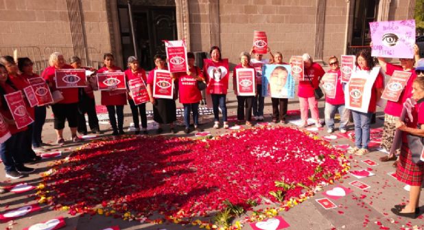 Con la figura de un corazón hecho por pétalos de flores y mensajes que señalaban que este 10 de mayo no hay nada que festejar, se colocaron cartulinas y mantas con mensajes y fotografías de las personas que estas madres buscadoras esperan regresen a casa, o al menos tener noticias de ellos.