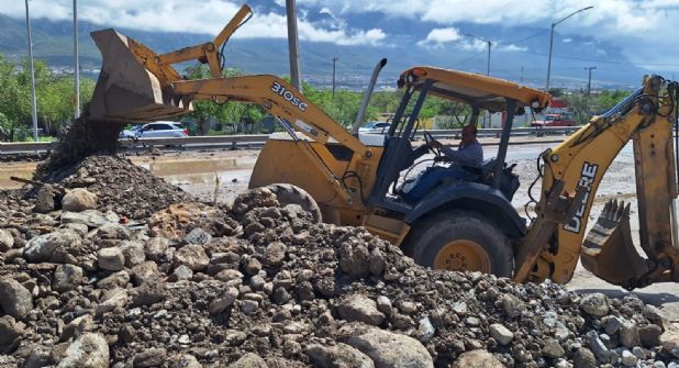 En busca de agilizar la vialidad en puntos críticos de la ciudad, estas acciones se realizan en la avenida Colosio, cercana al Cerro de las Mitras, donde retroexcavadoras y camiones de tres y media toneladas retiran el material que dejó obstruidas las vías.