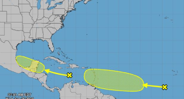 “Una onda tropical sobre el Mar Caribe central está produciendo una actividad de lluvia desorganizada mientras se mueve rápidamente hacia el oeste a alrededor de 25 millas por hora”, señaló el NHC respecto a la primera perturbación.