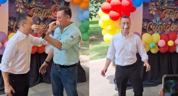 Tras cantarle, y tararear una parte de las mañanitas, el munícipe regio fue impulsado al grito de “¡mordida, mordida!” donde acompañado del director de enlace de la secretaría de Servicios Públicos, Francisco Castro, quedaron mutuamente embarrados de betún en parte de la cara.