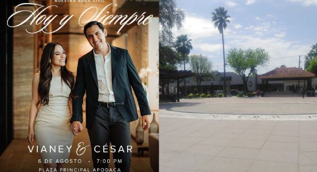 “(César) Nos vamos a casar y queremos compartir ese momento con todos ustedes que nos han acompañado en nuestra historia de amor, por eso estamos organizando nuestra boda civil en la plaza principal de Apodaca, (Vianey) este martes 06 de agosto, a las 7 de la noche, (César) va a ser un evento 100% familiar, vamos a tener refrescos, comida, música, todo lo que se necesita para disfrutar, va a ser un evento donde celebraremos los valores familiares, los valores del amor en Apodaca, ayúdenos a compartir, les esperamos ese día, ¡ánimo!”