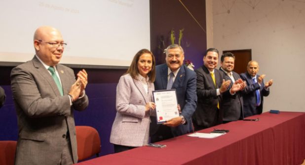San Nicolás de los Garza, NL- Tras entregar certificados del Estándar de Competencia 1334 CONOCER, el rector de la Universidad Autónoma de Nuevo León, Santos Guzmán López, reconoció a la alcaldesa del municipio de Guadalupe, Cristina Díaz, por los apoyos ofrecidos durante su labor en el servicio público.