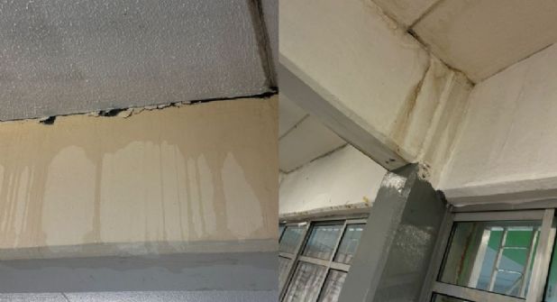 Además, se observó desprendimiento de impermeabilizante en algunas áreas del edificio.