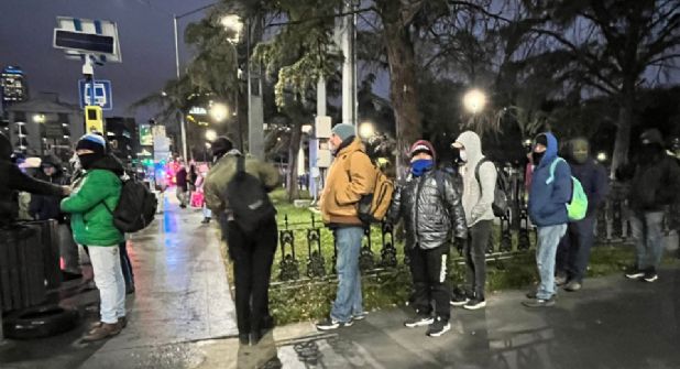 Personal de la Guardia Nacional estuvo presente en el lugar para apoyar a resistir el frío con una pieza de pan y un vaso de café, lo cual fue aprovechado por varios transeúntes que se formaron para recibir su bebida caliente.