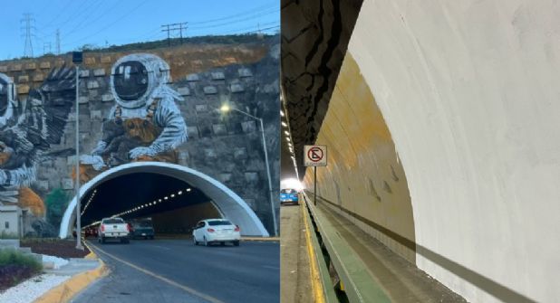 Monterrey.- A las paredes interiores del túnel de la Loma Larga se les están removiendo los característicos murales pintados durante la administración anterior de Monterrey.