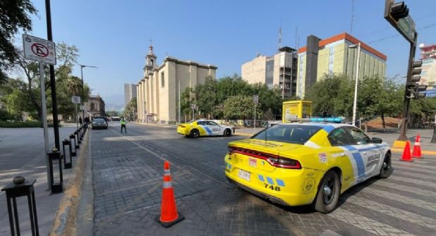 Unidades de movilidad de Monterrey estuvieron resguardando los cierres viales realizados en las calles Zaragoza y Zuazua entre Washington y la avenida Constitución.