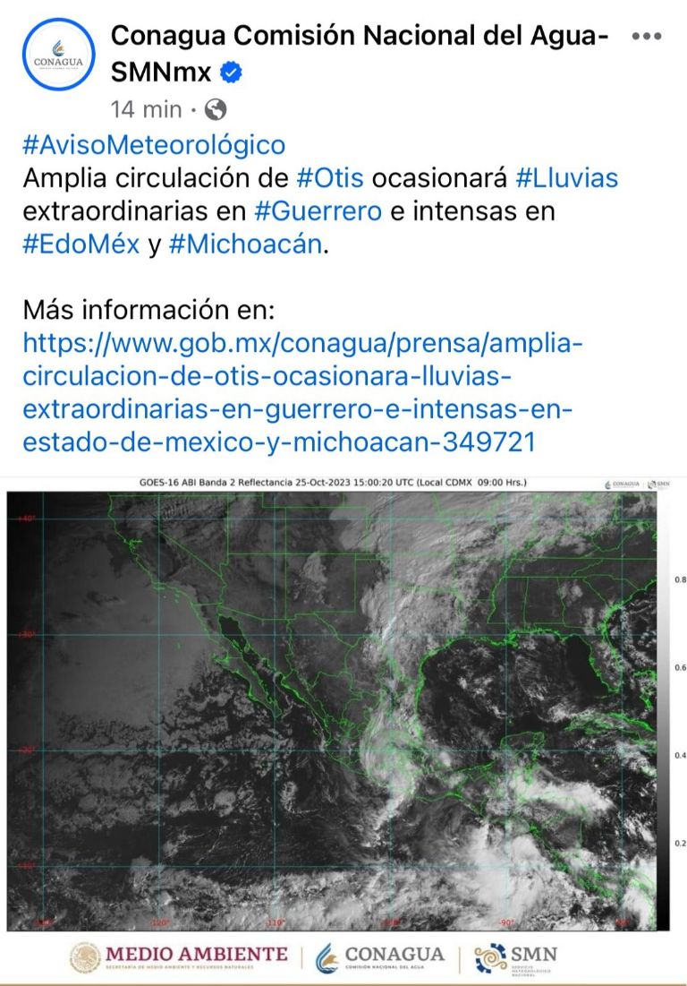 En el último aviso del Servicio Meteorológico Nacional (SMN), Otis se ubicó sobre tierra a 20 kilómetros al sureste de San Miguel Totolapan y 160 kilómetros al noroeste de Acapulco, localidades del estado de Guerrero, que permanece con problemas de comunicación.