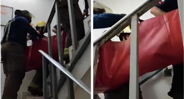El hecho fue captado en video donde se observa como un grupo de Bomberos llevan al paciente por las escaleras.