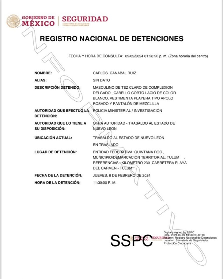 Se dio a conocer que Canabal Ruiz fue trasladado de inmediato al estado de Nuevo León, donde permanece internado en el Centro de Reinserción Social Número 1 de Apodaca.