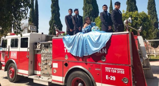 De acuerdo con el municipio, la joven decidió posar junto al camión de bomberos para rendirle homenaje a su padre, que labora en Bomberos Voluntarios del Valle del Mezquital, y a su mamá, quien es enfermera en el Hospital Cinta Larga, por todo el esfuerzo que han hecho ambos para sacarla adelante y por organizarle su festejo de XV años.