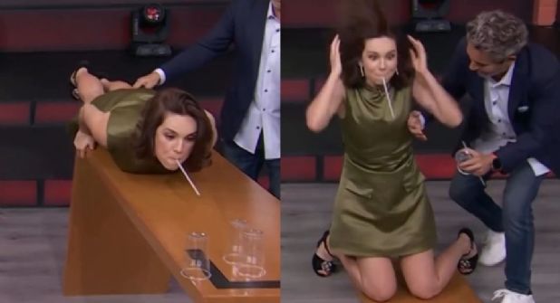 Esta consistía en que los participantes tenían que hacer llegar un vaso de plástico a un extremo a otro de una mesa de madera, soplándoles con un popote. Tras no poder moverlos, Rincón quiso subirse al escritorio, pero este tronó y la presentadora terminó en el suelo.