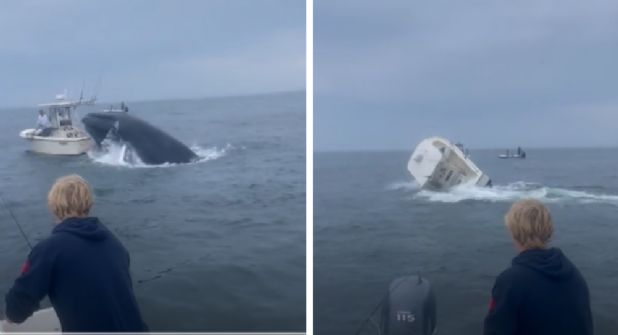 En el video que circula en redes sociales, se aprecia el momento en que la ballena emerge de las aguas y cae sobre la parte trasera de la barca, volteándola y lanzando a sus ocupantes al mar.