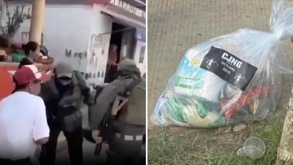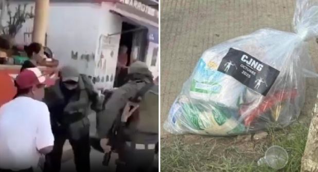 En un video que circula en las redes sociales, se puede ver a varios hombres encapuchados y armados acercándose a los damnificados para hacerles entrega de bolsas con víveres, mientras les decían “de parte del Cártel Jalisco Nueva Generación”.