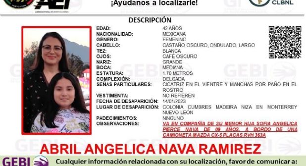 Abril de 42 años desapareció en la colonia Cumbres Madeira Niza en el municipio de Monterrey. Autoridades refieren que Abril va en compañía de su hija menor identificada como Sofía Angélica Pierce Nava de 9 años de edad y que ambas iban a bordo de una camioneta tipo Mazda CX-5 con placas RVH363A al momento de su desaparición.