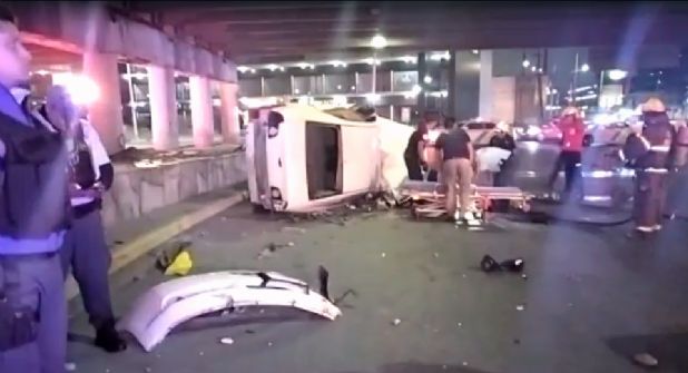 Posteriormente, el auto compacto en el que viajaban cinco se volcó y se impactó nuevamente, pero con el muro de contención del lado derecho del carril de baja sobre Ruiz Cortines en el lado izquierdo.