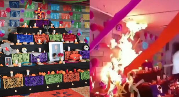 Imágenes y videos en redes sociales muestran las llamas que emergieron desde la parte alta del adorno propio al Día de Muertos, donde se encontraban dos veladoras y una cruz hecha en base a flores aparentemente artificiales.