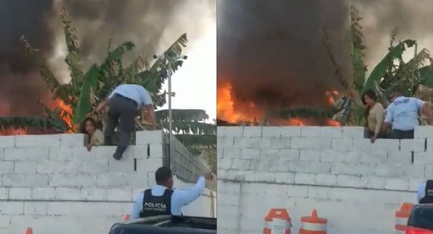 A través de las redes sociales, se difundió el video donde un elemento de la policía sube a una barda para rescatar a la mujer que se encontraba en el predio donde había un incendio.