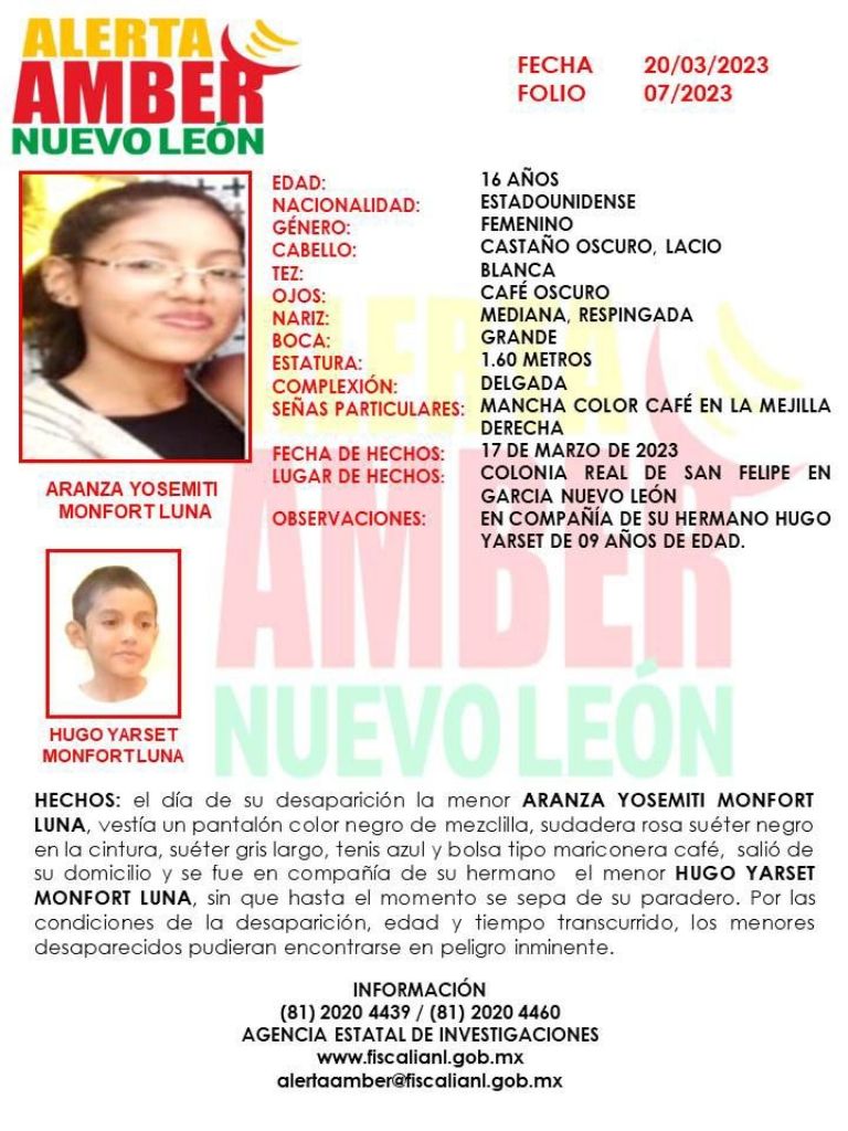 De acuerdo a la ficha de búsqueda emitida por la Agencia Estatal de Investigaciones (AEI) y el Grupo Especializado de Búsqueda Inmediata (GEBI), los menores son identificados como Hugo Yarset Monfort Luna de 9 años y Aranza Yosemiti Monfort Luna de 16.