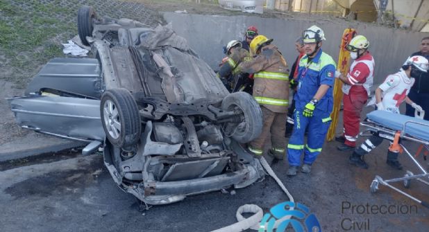 Debido a lo aparatoso de la volcadura, los tripulantes de este automóvil quedaron prensados en el interior de la unidad, por lo que cuando los elementos de Protección Civil llegaron tuvieron que utilizar equipo de rescate hidráulico para poder liberarlos.