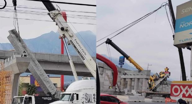 Santa Catarina.- Una de las vigas que sostendría la carpeta asfáltica de una parte de la estructura del Megapuente en Santa Catarina se partió en dos durante su colocación.