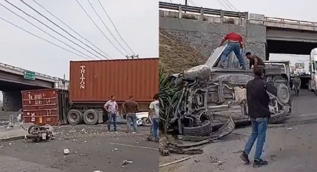 Tras volcar, la primera de las dos cajas que transportaba fue proyectada y a su vez impactó varios muros de contención, mismos que golpearon una camioneta Durango y una motocicleta Vento.