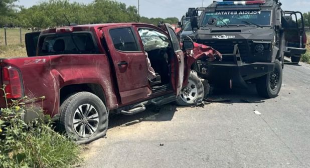 En la imagen compartida por el Grupo de Coordinación, se aprecia a una camioneta pick-up en color rojo, con las puertas y vidrios abajo, las llantas ponchadas, bolsas de aire activadas, además de estar estrellada con una unidad de la Policía Estatal.