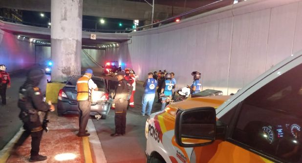 Elementos de Protección Civil llegaron al lugar para brindar auxilio, pero la mujer ya no presentaba signos vitales. La mujer estrelló su automóvil gris contra el muro de un paso a desnivel.