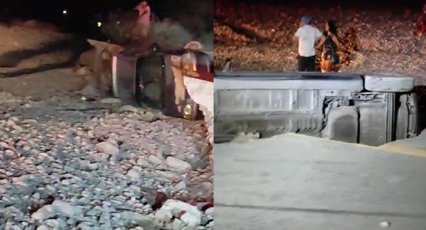 Santa Catarina.- Un vehículo se volcó en el interior del parque La Huasteca, en el municipio de Santa Catarina, Nuevo León.
