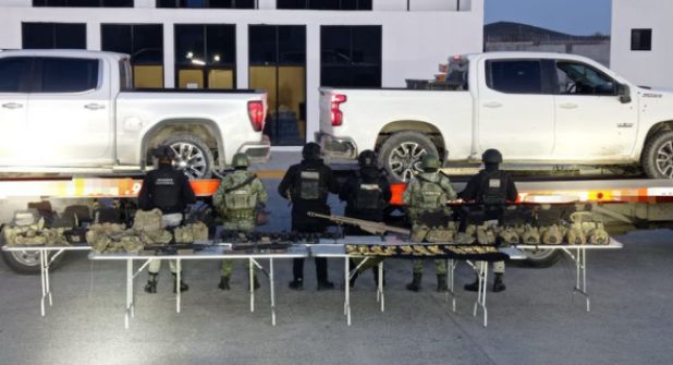 Monterrey.- Tras la implementación del Operativo Muralla en el municipio de Bustamante, Fuerza Civil de Nuevo León reportó el aseguramiento de dos vehículos tipo pick-up, seis armas largas, un fusil Barret, equipo táctico como chalecos, y diversos cargadores y cartuchos de diferentes calibres.