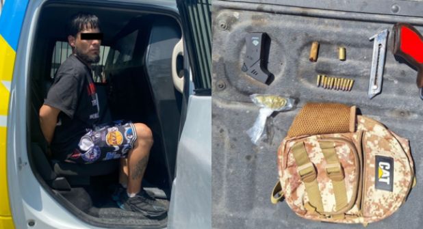 Tras asegurarlo, los uniformados procedieron a revisar sus pertenencias y encontraron en su bolsa tipo “cangurera”: un arma tipo escuadra calibre .22, con un cargador y 11 cartuchos útiles, un cartucho adicional calibre .45, una bolsa de plástico con hierba verde con características similares a la marihuana.