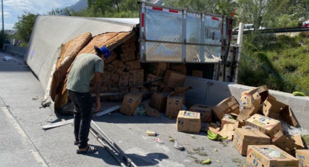 Monterrey.- Una intensa congestión vehicular se vivió la tarde de este lunes en el bulevar Gustavo Díaz Ordaz, luego de que un tráiler cargado con plátanos volcara en una curva a la altura del cruce con la avenida Aarón Sáenz, en la colonia Santa Bárbara, en Monterrey.
