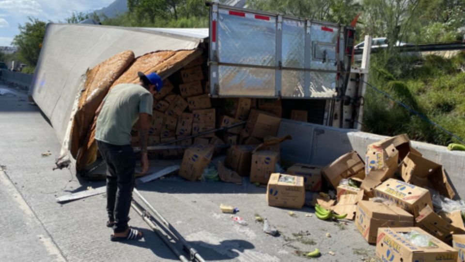 El accidente ocurrió alrededor de las 13:37 horas, cuando el conductor del tráiler, identificado como Francisco de León, de 46 años y originario de Allende, perdió el control de la unidad debido al peso excesivo de la carga. La unidad, que transportaba dos remolques con cerca de 20 toneladas de plátanos cada uno desde Tapachula hacia Saltillo, volcó sobre la vialidad.