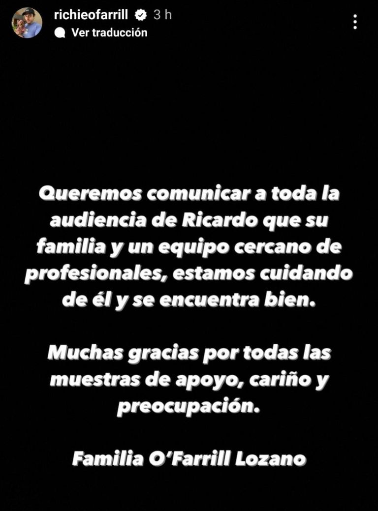 "Queremos comunicar a toda la audiencia de Ricardo que su familia y un equipo cercano de profesionales, estamos cuidando de él y se encuentra bien. Muchas gracias por todas las muestras de apoyo, cariño y preocupación. Familia O'Farril Lozano", se lee en la historia de Instagram.