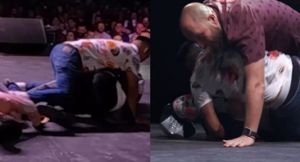 A través de su cuenta de Instagram, el comediante subió un video del momento en que dos de los tres hombres se le lanzan encima, provocando que el payaso se lesionara la costilla.