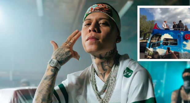 En el video se aprecia el momento en que Santa Fe Klan se agacha y se detiene de una de las barandillas del camión.